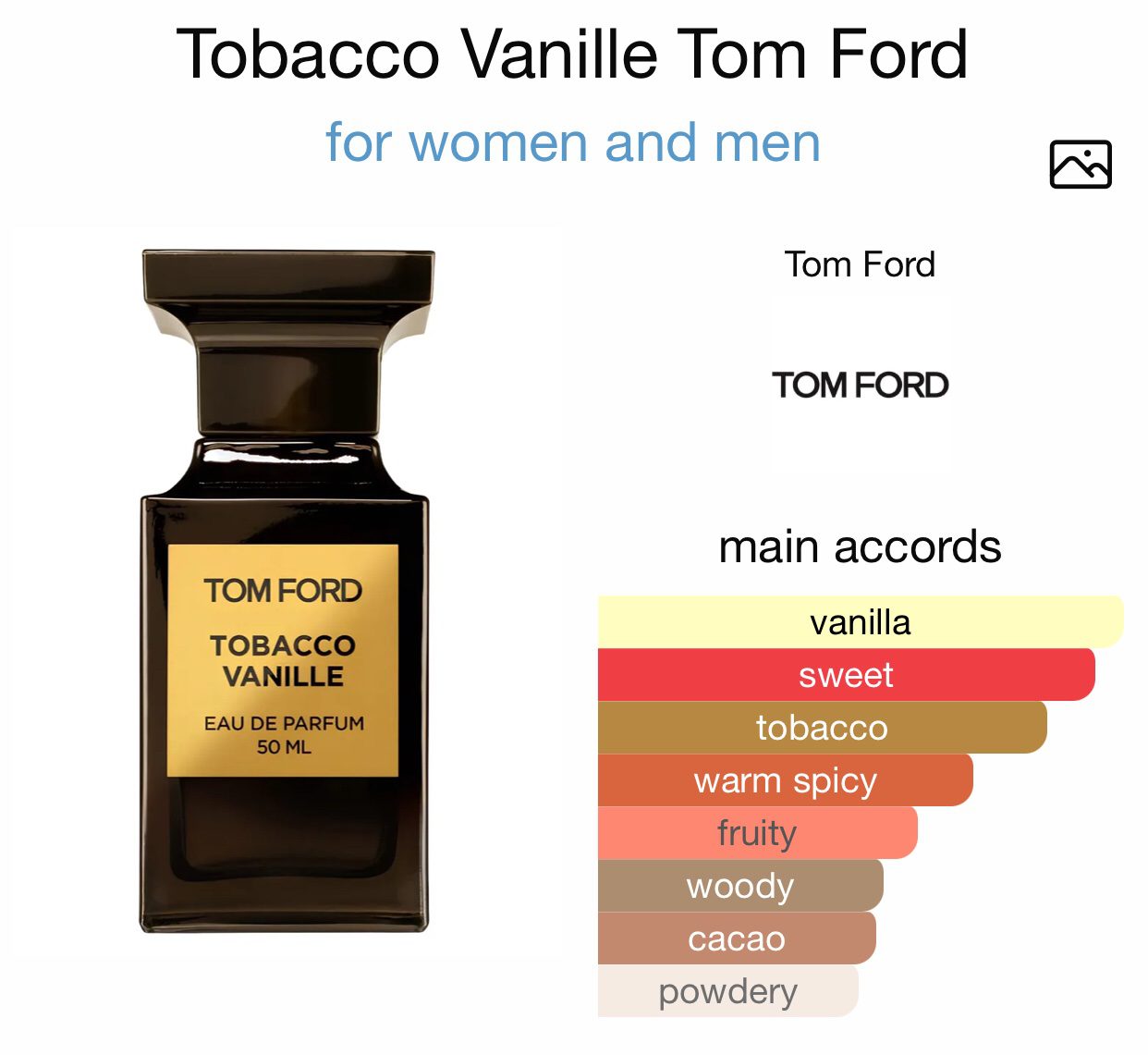 Middle notes are Vanilla, Cacao, Tonka Bean and Tobacco Blossom;