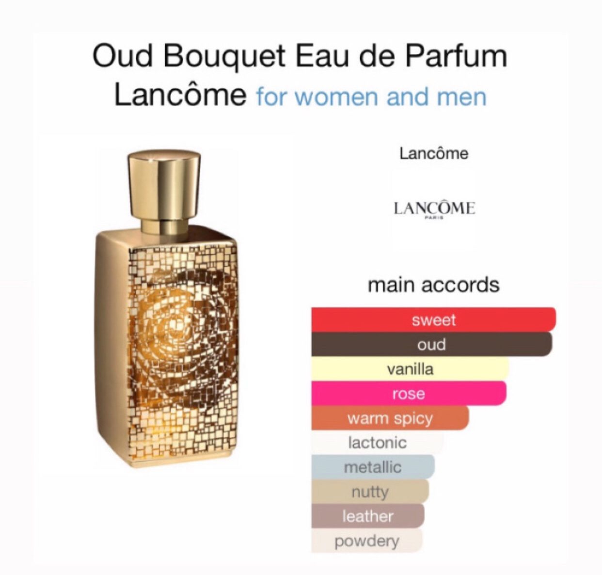 Key notes are Agarwood (oud), praline, Vanilla, Rose, Saffron.